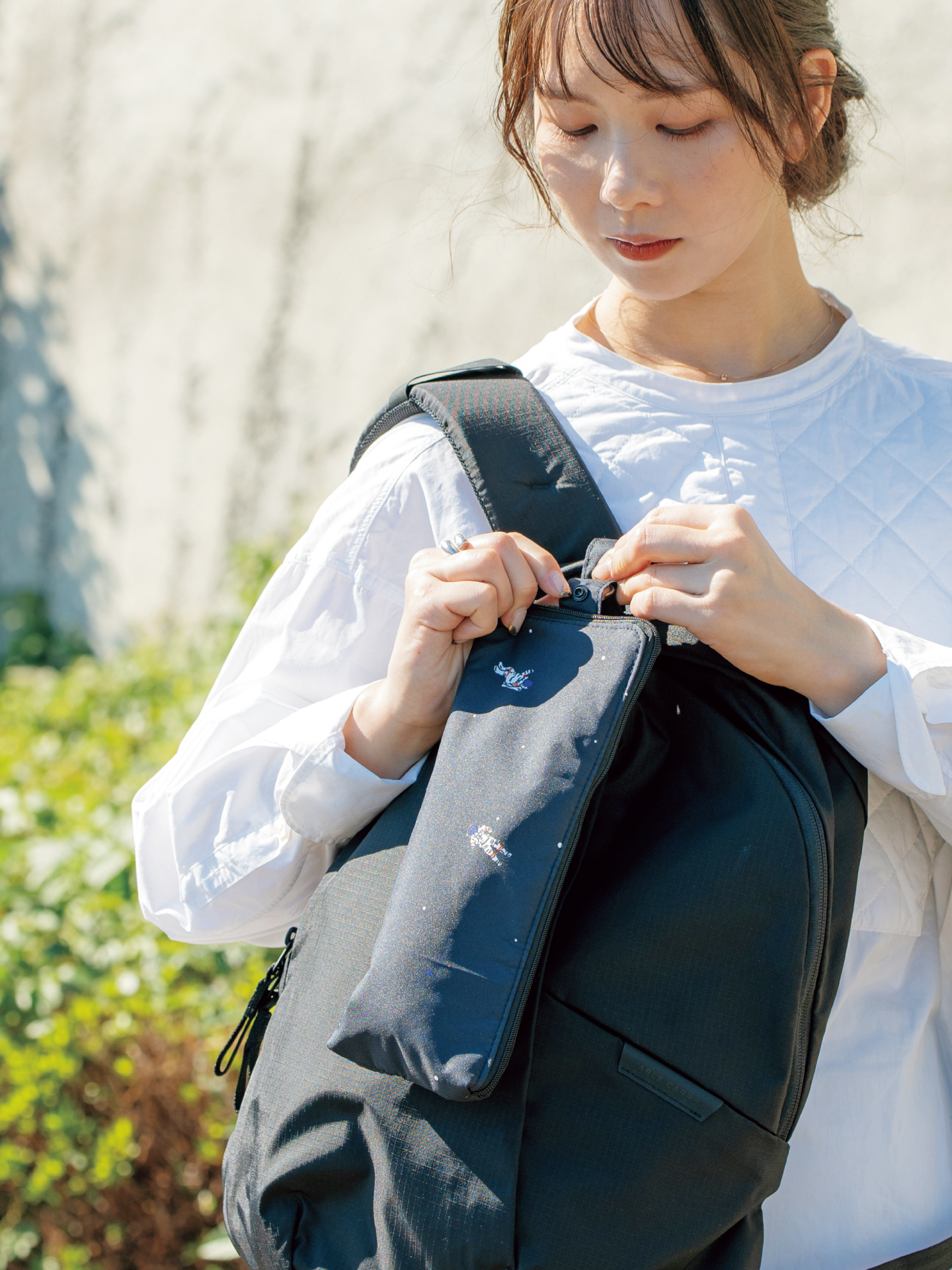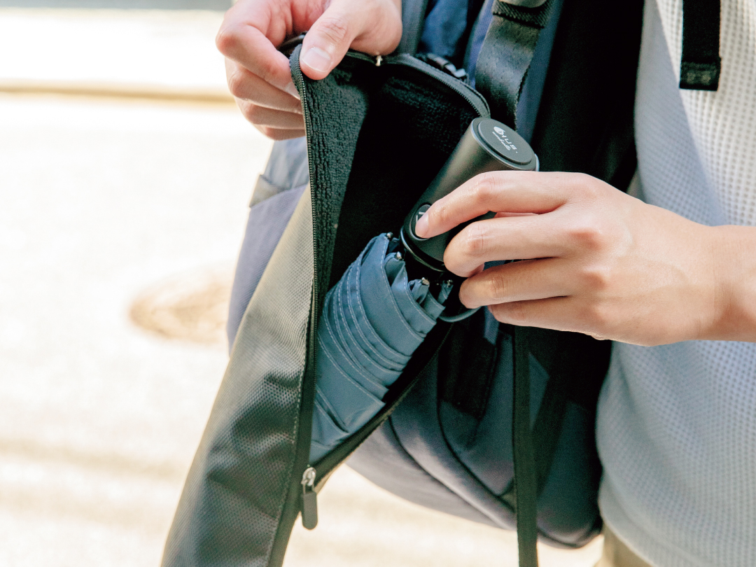 ケースを使用していない間は、本体をまとめてスナップボタンで留め、カバンに取り付けてコンパクトに持ち運びができます。カバンに取り付けておけば、屋内に入る際にさっと取り外して傘がしまえるので便利です。